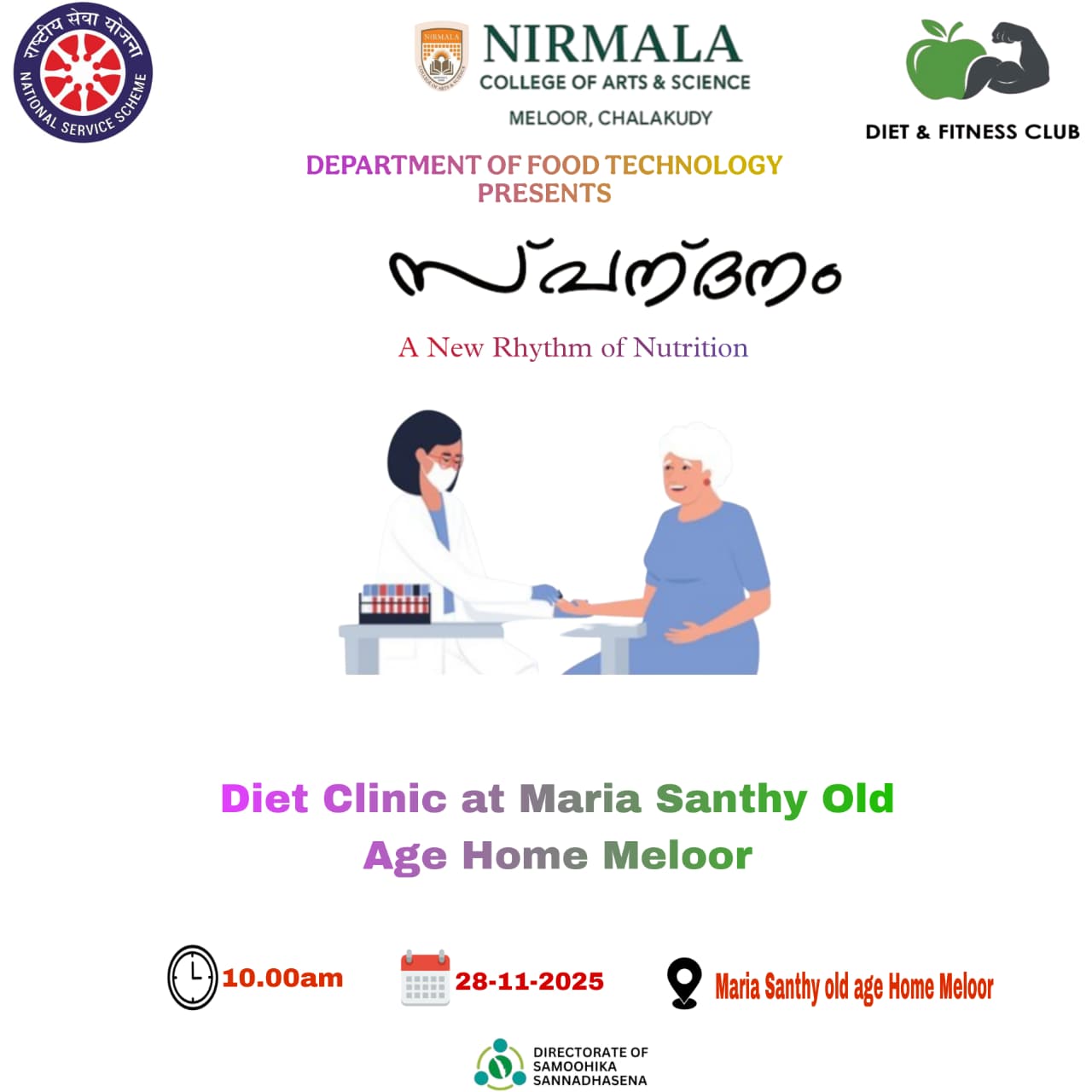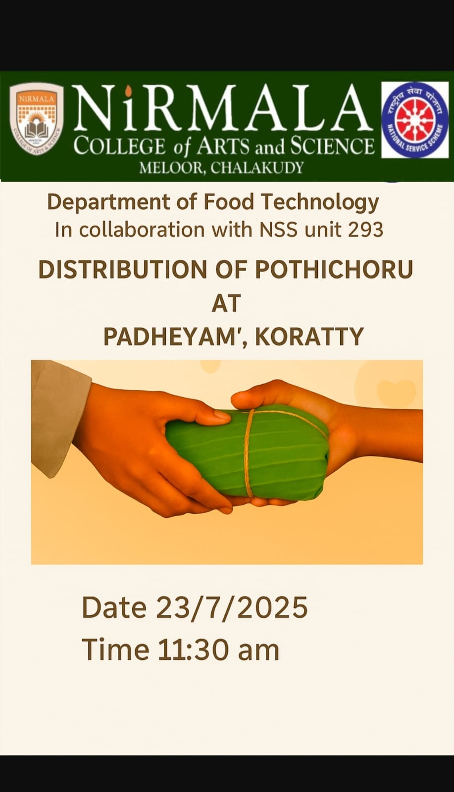 The department of Food Technology done some social activities such as PADHEYAM -DISTRIBUTION OF POTHICHORU at koratty , SPANDHANAM-Diet clinic at MARIA SANTHY OLD AGE HOME ,MELOOR & JANANI -THE BLOOMING MOTHERHOOD(Awareness class on Nutrition for pregnant women and lactating mothers(Muringoor Vadakkumuri Anganwadi)